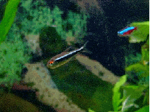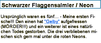Die größte Fischgruppe bilden die 26 roten Neon-Fische. Noch sind sie gerade mal ca. 1,5 cm lang. Ihr knallroter Körper und der leuchtend blaue Streifen sorgen für Farbe im Becken.